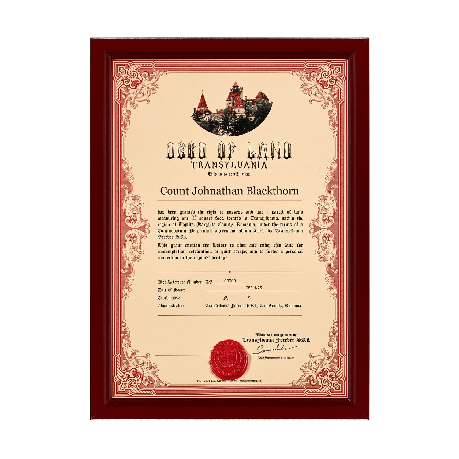 Display your Transylvanian Land Certificate, signed and sealed in Dracula’s homeland.